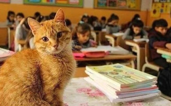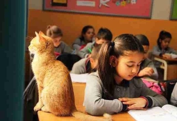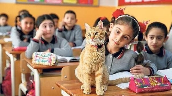 Удивительная история уже второй год продолжается в турецком городе Измир. В прошлом году к начальной школе прибился уличный рыжий котенок. Дети стали его подкармливать, играться, и котик все чаще заходил в школу. Особенно он любит сидеть с детьми 3-го класса. Сортудники школы обработали котика от паразитов, а дети назвали его Томбо.