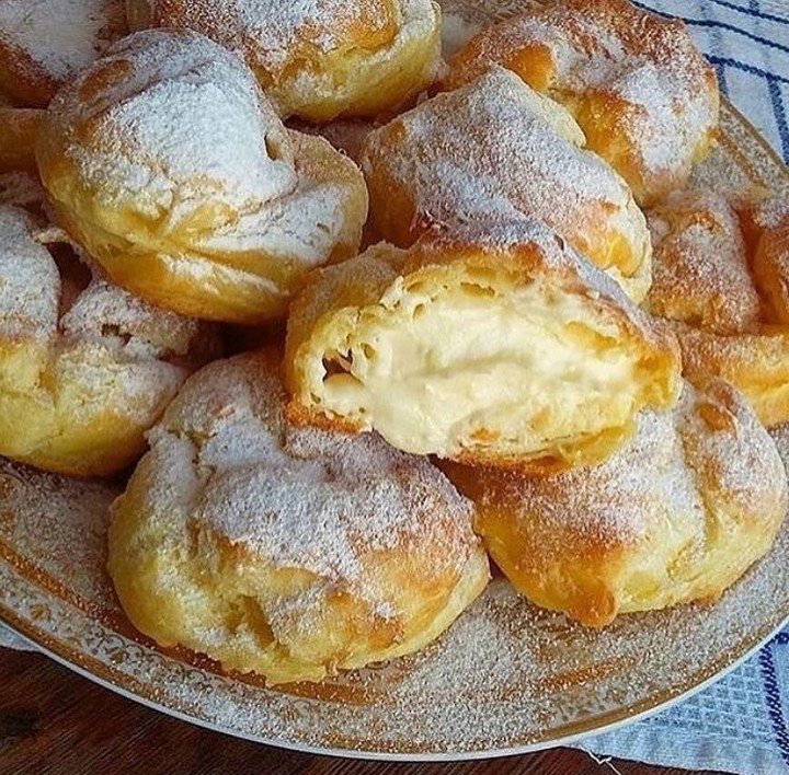 Сливки взбить с сах. пудрой, добавить сыр, перемешать до однородной массы. Кондитерским шприцом начинить заварные. Посыпать сах. пудрой.